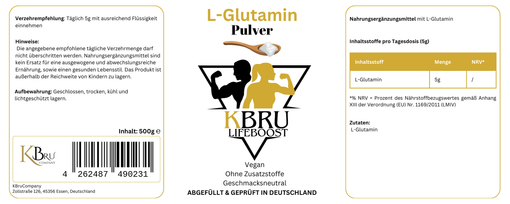 - Reinheit und Qualität von KBru LifeBoost: Das Produkt besteht zu 100% aus L-Glutamin ohne Zusatzstoffe oder Konservierungsmittel.